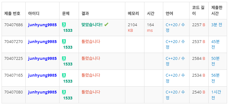 원래라면은 제 목표는 '실력을 증진시켜서 대회 등등에서 좋은 지표를 얻는다' 이런 마인드였지만, 현재 목표가 '키링을 얻기 위해서 다이아 5를 찍는다'가 되었는 이상 제가 요새 푼 문제들은 제가 원래 주로 풀었던 문제들과 다른 양상을 보였습니다. 원래 제가 주로 푼 문제들은 내가 이미 알고 있는 지식들 및 알고리즘만을 활용해서 풀 수 있으나 상당한 사고력을 필요로 하는 문제들 위주로만 풀었는데, 현재 제가 티어작을 목표로 하고 있는 이상은 제가 모르는 알고리즘이지만 공부하고 이에 대한 기본 문제 및 약간의 응용하는 문제들을 위주로 풀었습니다. 또한, 제가 일부로 솔루션을 대략 알지만 귀찮아서 풀지 않았거나 어느정도 티어가 올라가면 풀려고 했던 문제들도 그냥 가능하면 다 풀어보았습니다. 그렇게 계속 티어작을 하던 도중 어느덧 딱 1점만 남기게 되었습니다.